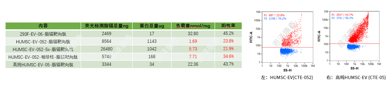 由此可见,使用袖珍柱进一步纯化提升纯度,可提高脂锚靶向肽的负载量和阳性率;高纯HUMSC外泌体纯度极高,负载量和阳性率可媲美293F外泌体参考品(CTE-06)。