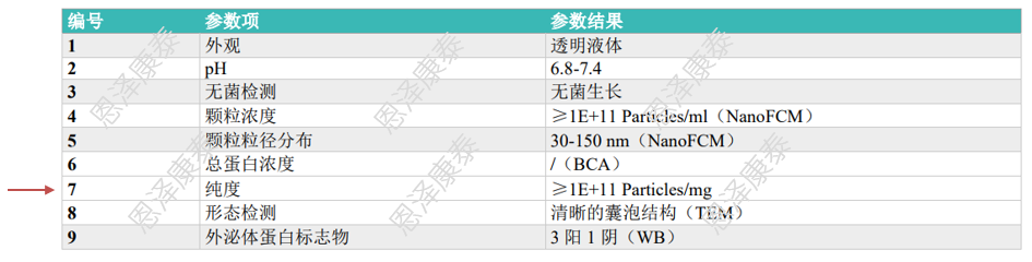 根据《人间充质干细胞来源的小细胞外囊泡团体标准T/CRHA 001—2021》中,建议的MSC外泌体关键质量属性“纯度”要求指标:小细胞外囊泡阴性标志物 GM130 或 Calnexin 应为阴性;小细胞外囊泡数量与蛋白量比值不低于 1×107个颗粒/微克蛋白。即particles/protein纯度应≥1E+10 particles/mg蛋白。