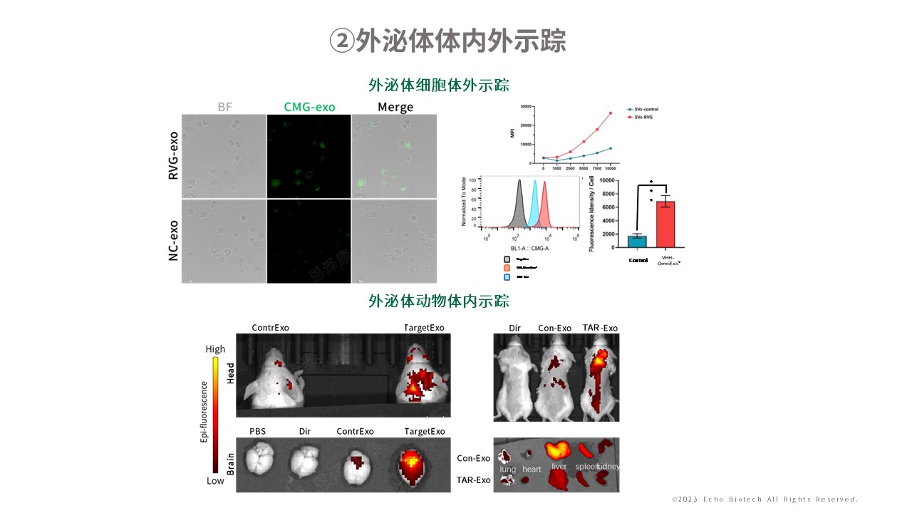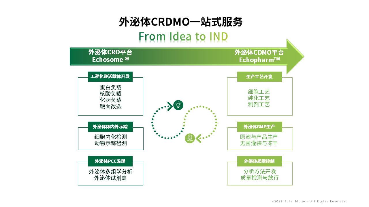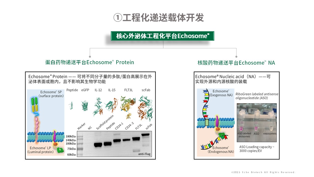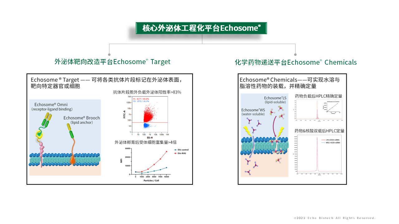 恩泽康泰基于Echosome®工程化外泌体CRO平台,提供外泌体蛋白负载、核酸负载、靶向改造、小分子负载等工程化递送载体开发服务、以及外泌体体内外示踪及PCC发现等早期外泌体药物成药性评估服务。