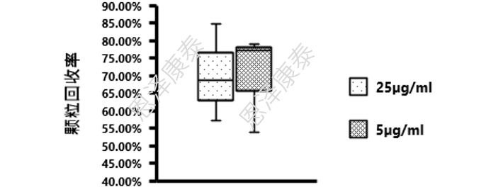 分别使用5µg/ml和25µg/ml的亲脂性荧光染料标记外泌体后,上样100µl到Exosupur®袖珍柱,收集E1,通过纳米流式测定颗粒数,计算颗粒回收率,将Exosupur®袖珍柱再生后继续重复几次实验,如图4所示。可见,不管使用低浓度还是中高浓度荧光染料标记的外泌体,使用Exosupur®袖珍柱进行几次重复实验,颗粒回收率相对较稳定,约在60%以上。