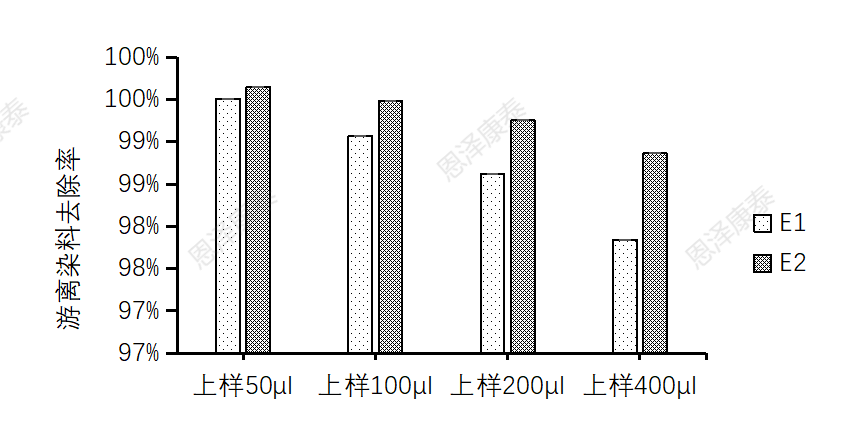对荧光标记后的外泌体进行不同体积上样,收集E1和E2,并经酶标仪检测荧光值,计算E1(1-E1荧光值/上样荧光值)或E2(1- E2荧光值/上样荧光值)组分的游离染料去除效率,上样100ul情况下去除效率超99%。
