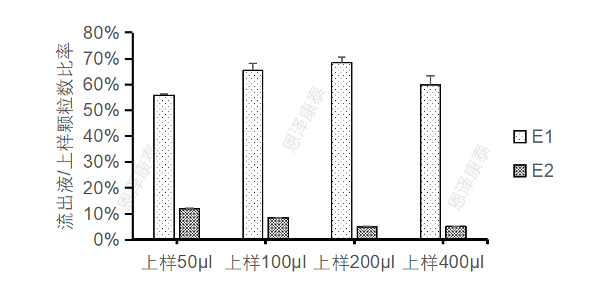 对不同体积的荧光孵育后的外泌体进行上样收集E1和E2,测定颗粒数,结果如下图1,上样100μl的情况下,颗粒总回收率(E1+E2的颗粒数/上样颗粒数)近80%。