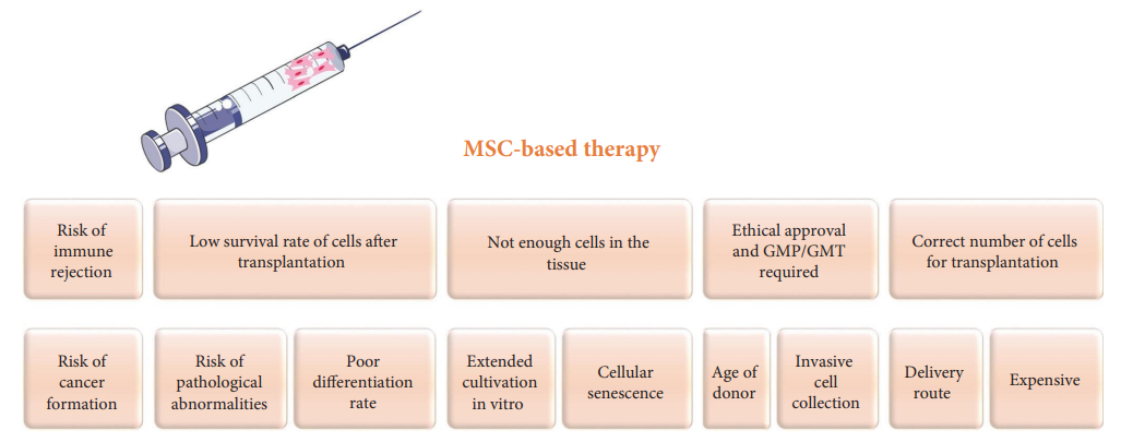 另一方面,做为近期大热的天然外泌体药物,间充质干细胞外泌体(MSC-Exo)的研究和应用都火出天际。MSC是一种来自于中胚层的多能干细胞,具有高度的自我更新及多向分化潜能,并在适宜的条件下具有诱导分化为肌细胞、软骨细胞、成骨细胞、成脂细胞等多种细胞的能力。MSC不仅具有多向分化潜能,而且还具有免疫调节功能,可抑制多种免疫细胞的性能,调节免疫应答。此外,在抗炎、抗凋亡、修复等方面表现突出。但MSC在应用过程中不得不考虑的问题有免疫排斥风险、伦理问题、成瘤风险、屏障穿透能力低、细胞移植后低存活率、组织缺乏足够的细胞量、病理异常风险、低分化率等。
