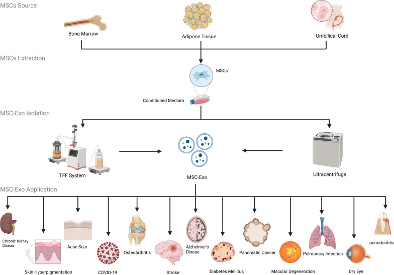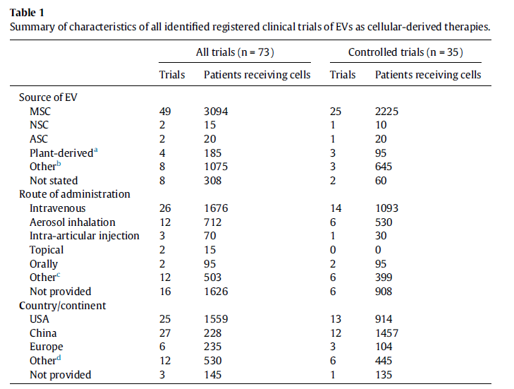 研究发现,来源于MSC的外泌体(MSC-Exo)具有与MSC相似的免疫调节、组织损伤修复和再生功能。越来越多的证据支持MSC通过旁分泌的机制来发挥作用,因此在干细胞外泌体的研究应用时并非将外泌体制备的越纯越好。与MSC相比,外泌体用于临床疾病的治疗更加稳定,体内同种异体给药后免疫排斥反应的可能性较低,屏障穿透力强,并可为各种疾病提供替代疗法,因此在外泌体的临床试验中MSC来源的外泌体遥遥领先。