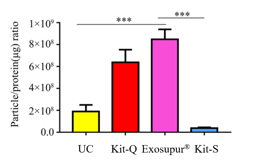 通过分离的血浆sEV particle数与蛋白含量比值评估外泌体纯度,结果显示Exosupur®分离的外泌体纯度更高,杂蛋白含量更低。