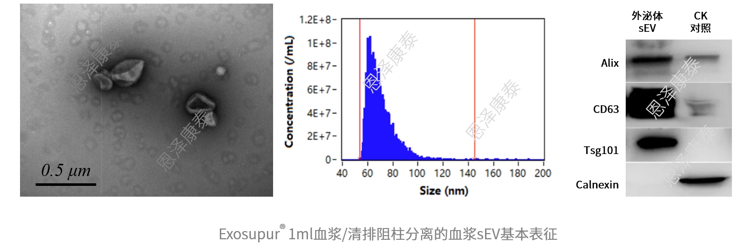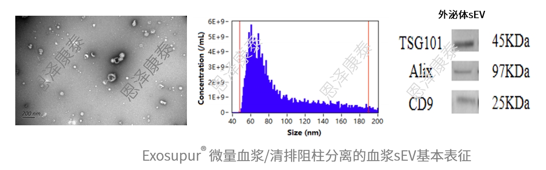 Exosupur®分离的血浆或微量血浆小细胞外囊泡sEV TEM电镜、WB和nanoFCM粒径表征。