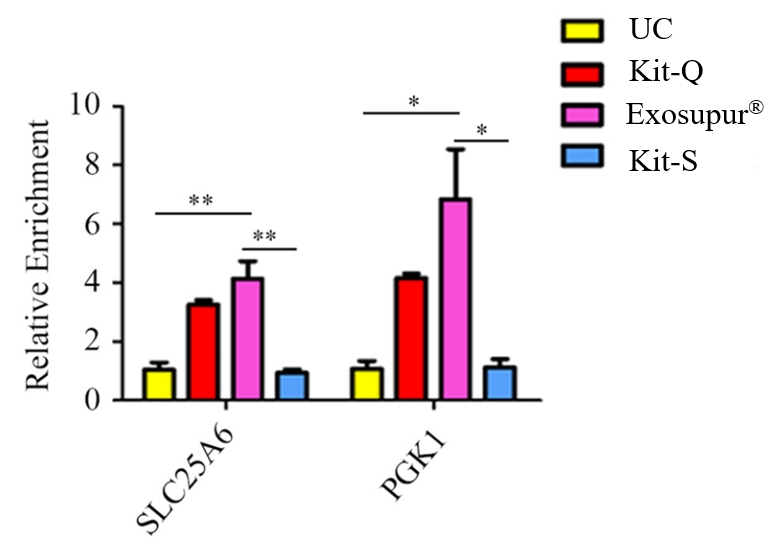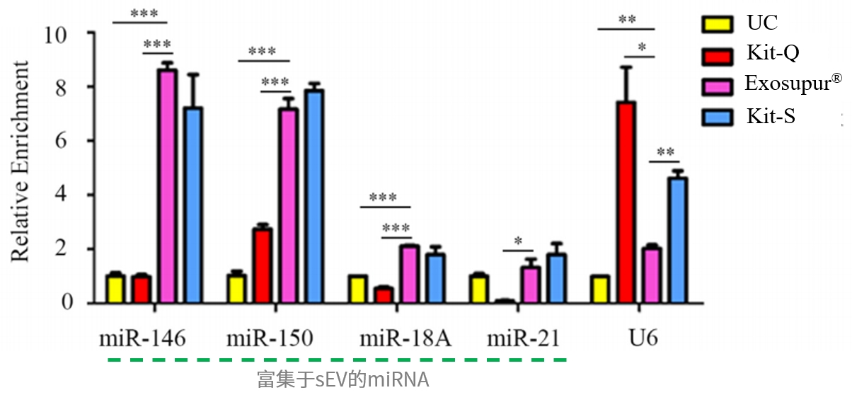对于miRNA,由于Exosupur®富集的外泌体得率更高、纯度更高,使得富集于sEV的miRNA定量值更高,而非富集miRNA定量值非常低,能够更准确分析sEV来源miRNA。