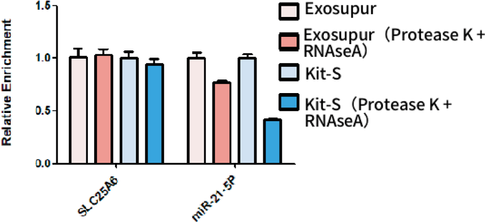 Protein K和RNase A双酶消化进一步证实了Exosupur®得到的RNA更多的是来源于囊泡,而囊泡外的游离RNA检测值更低。