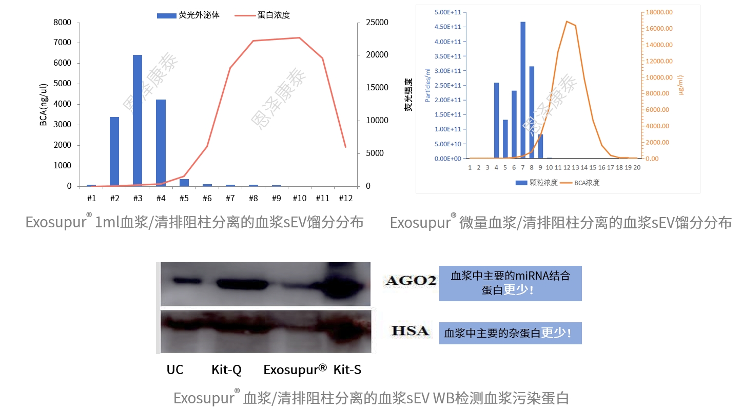 下左图为1ml血浆/清排阻柱(ES9P14e、ES9P11e)分离1mL血浆sEV效果,下右图为微量血浆/清排阻柱(ES9P021e、ES9P024e)分离0.2mL微量血浆sEV的效果。