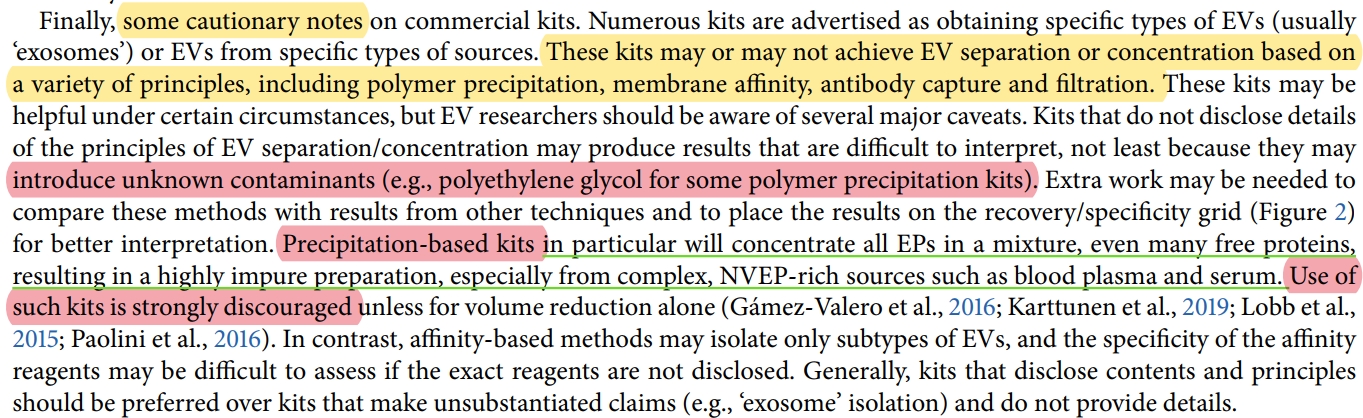 免疫捕获(IC) | l 产物纯度高; l 但是,依赖抗原表达,存在亚群的偏好性; l 另一方面,磁珠抗体价格昂贵,不适合处理大体积样本; l 最后,在使用抗体磁珠处理血浆这类样本时,试剂盒官方推荐先建议采用SEC试剂盒对样本进行一个预纯化,变相说明免疫捕获法对于复杂样本的直接处理能力并不理想。 |