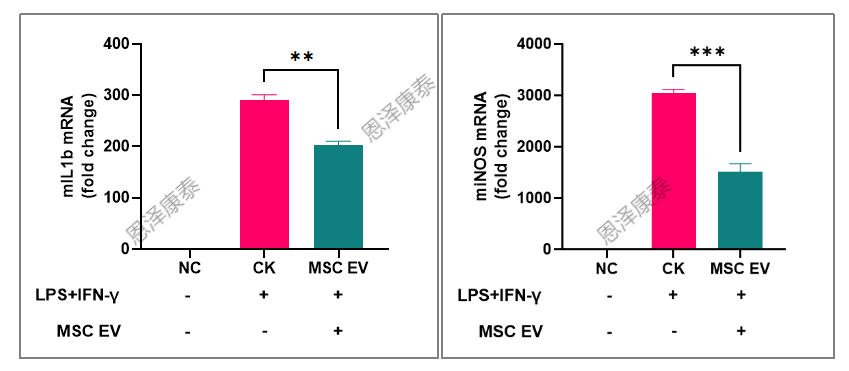 干细胞外泌体的抗炎活性检测:HUMSC外泌体对IL1b(左)、iNOS(右)基因表达的影响