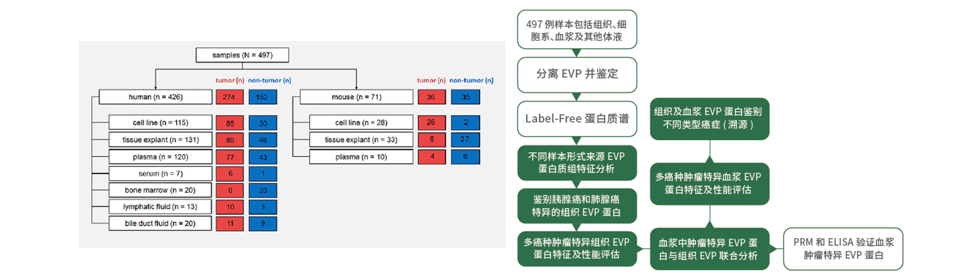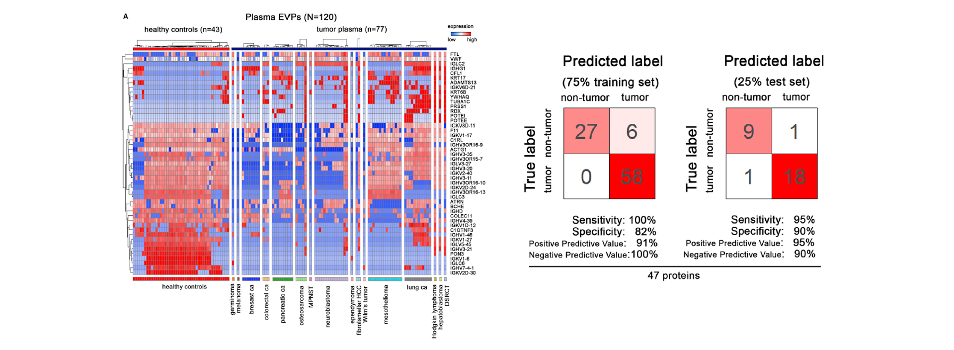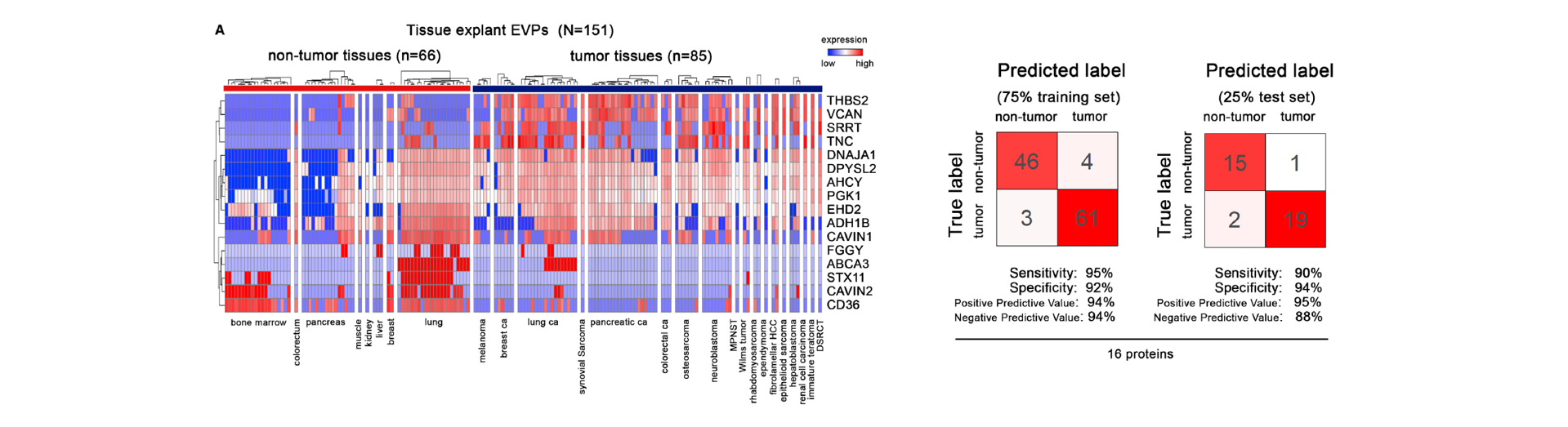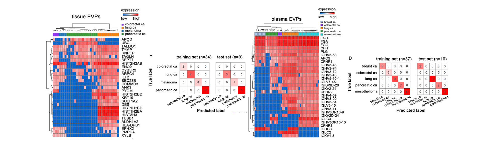 •在组织及血浆中鉴定出肿瘤类型特异的EVP蛋白panel,能区分肿瘤来源。证明了EVP蛋白可以作为癌症诊断及溯源的有效标志物。