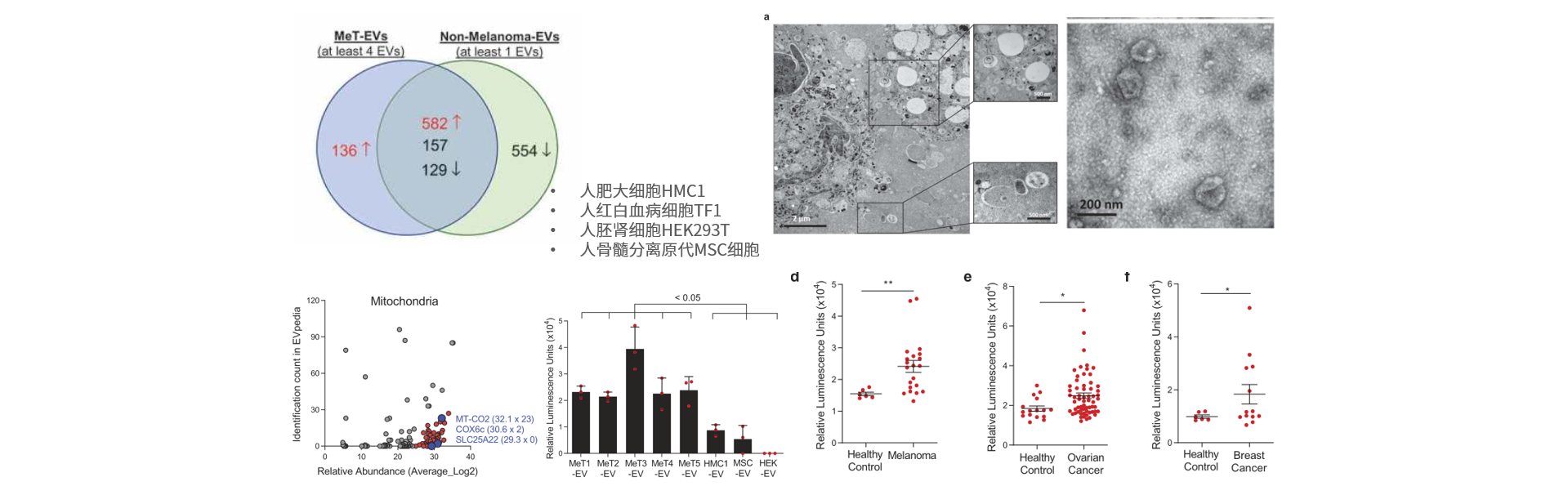 线粒体膜蛋白在黑色素瘤组织来源的 EV中显著富集。另外,2种线粒体内膜蛋白MT-CO2和COX6c在黑色素瘤患者、卵巢癌和乳腺癌患者的血浆中含量较高。肿瘤组织在EV中富含线粒体膜蛋白,并且研究结果可以在多种肿瘤血浆中重现。经典EV生物发生途径和线粒体EV途径可能相互作用,这是EV生物发生的一个新范式。
