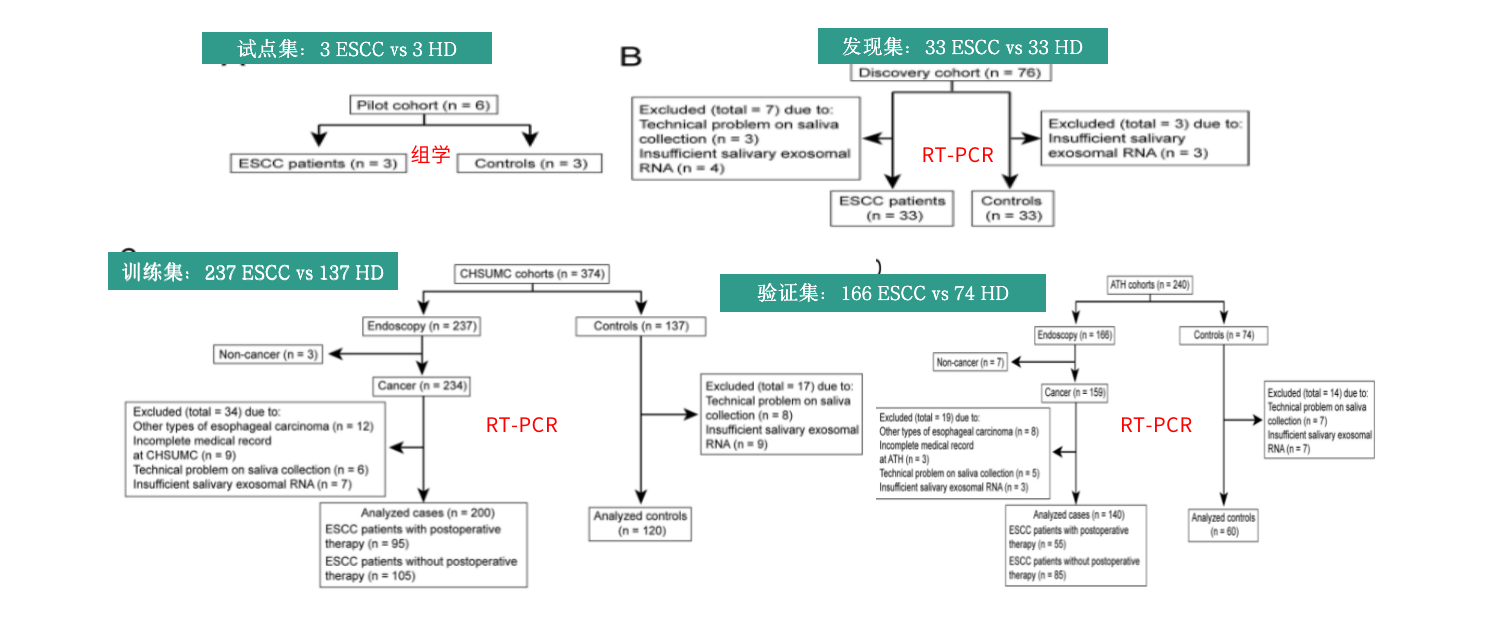 A signature of saliva-derived exosomal small RNAs as predicting biomarker for esophageal carcinoma: a multicenter prospective study. Mol Cancer. 2022 Jan 18;21(1):21.